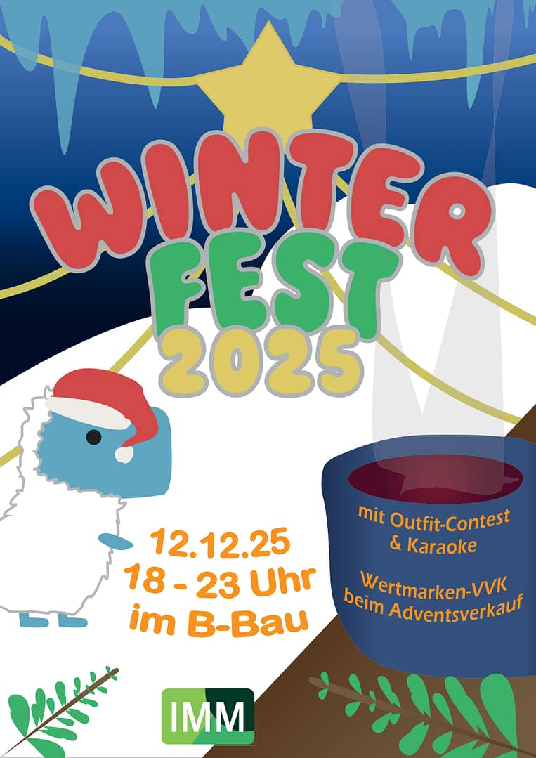 Am 12.12 von 18 bis 23 Uhr findet das Winterfest der Fachschaft IMM im B-Bau statt.🎅🏻